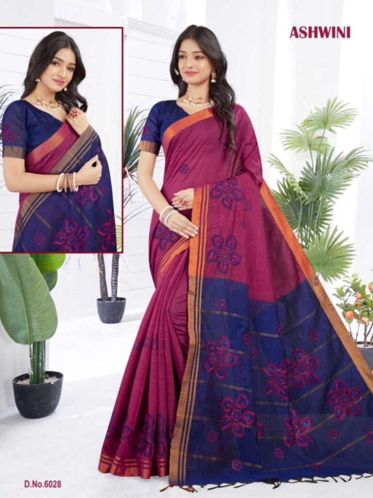ASWINI SILK COTTON EMBROIDERY WORK SAREE 6028 – [Pink]