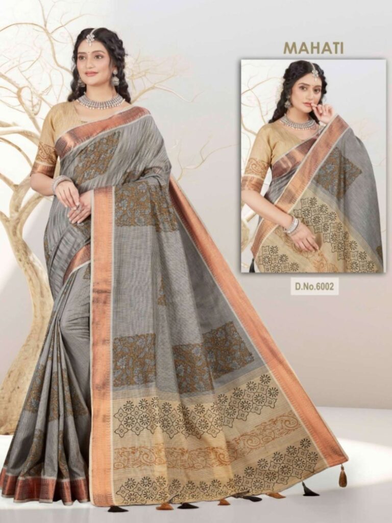 KHADI SILK COTTON SAREE – HAND BLOCK PRINTED – 6002 – [Gray]