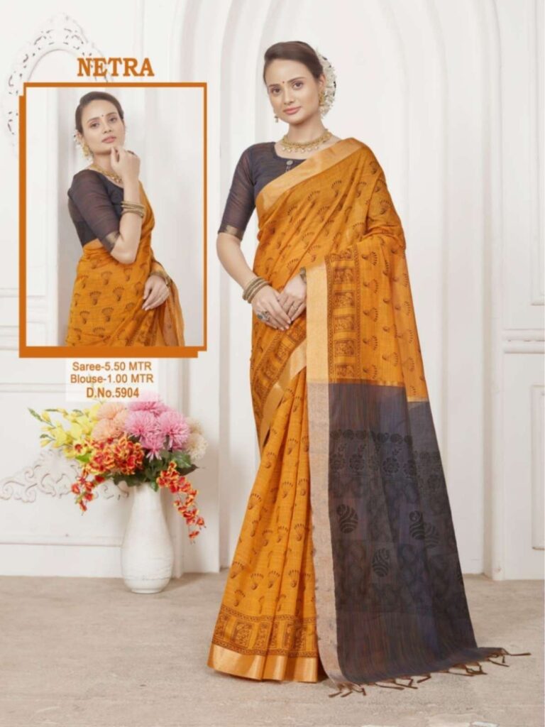 NETHRA ( SILK COTTON ) PRINTED SAREE #5904 – MUSTRAD YELLOW X GRAY – [Yellow]