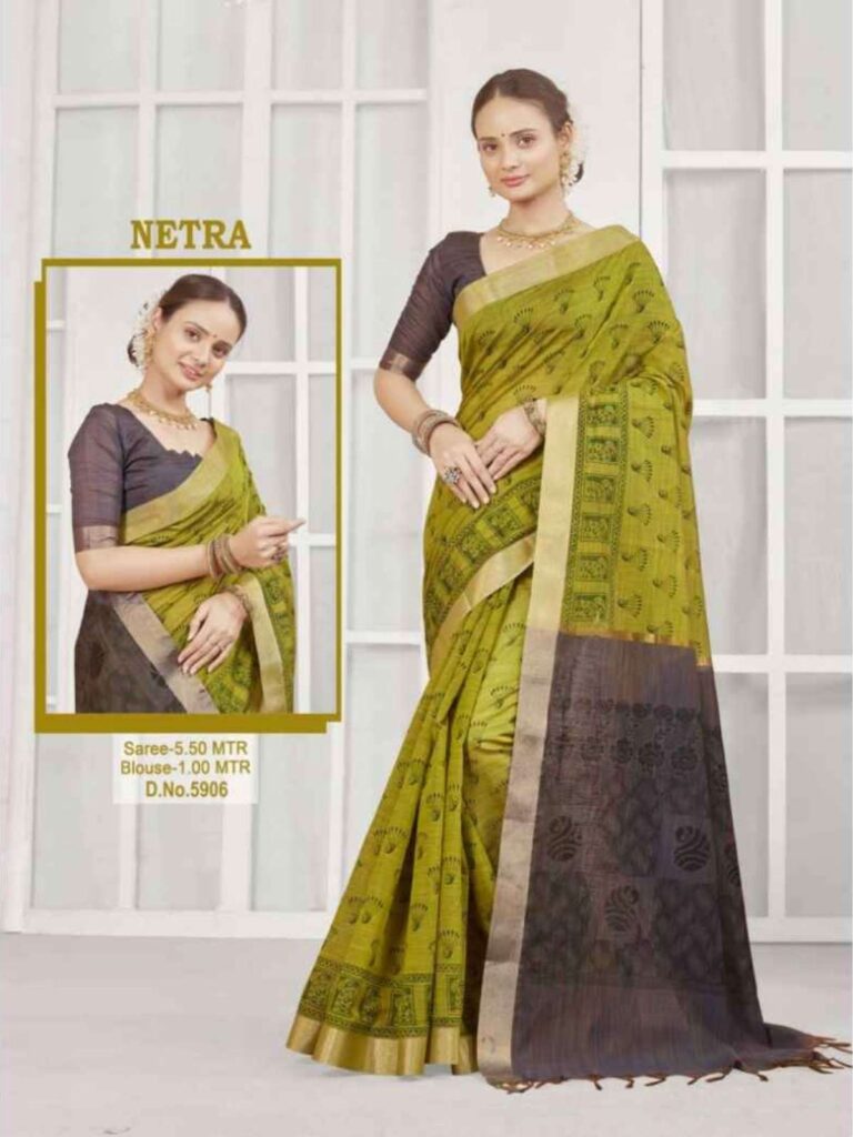 NETHRA ( SILK COTTON ) PRINTED SAREE #5906 – OLIVE GREEN X GRAY – [Green]