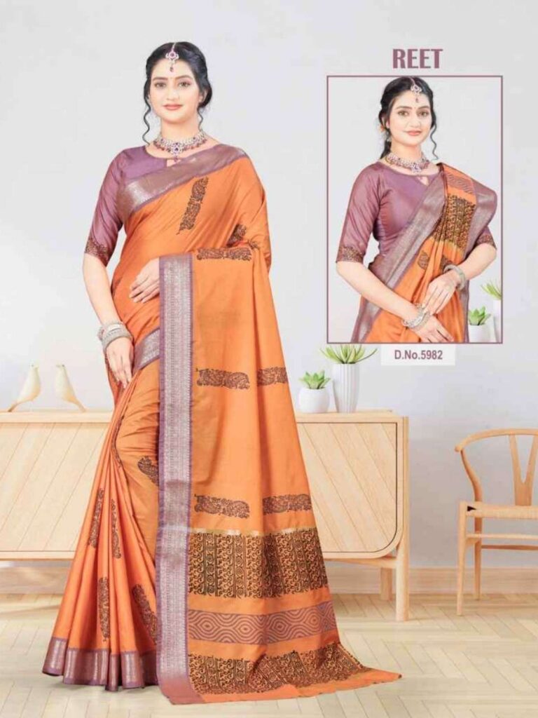 REET ( SOFT COTTON ) HAND BLOCK PRINTED SAREE #5982 – PASTEL ORANGE X DUSTY LAVENDER – [Orange]