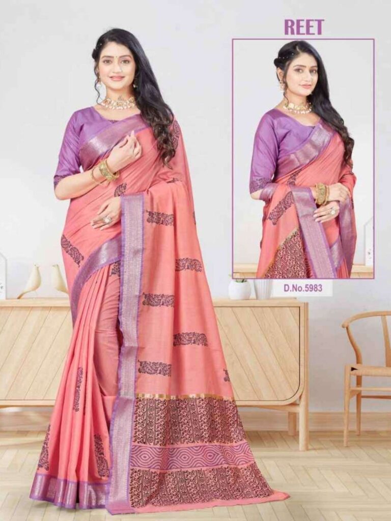 REET ( SOFT COTTON ) HAND BLOCK PRINTED SAREE #5983 – RUDDY PINK X PALE PURPLE – [Pink]
