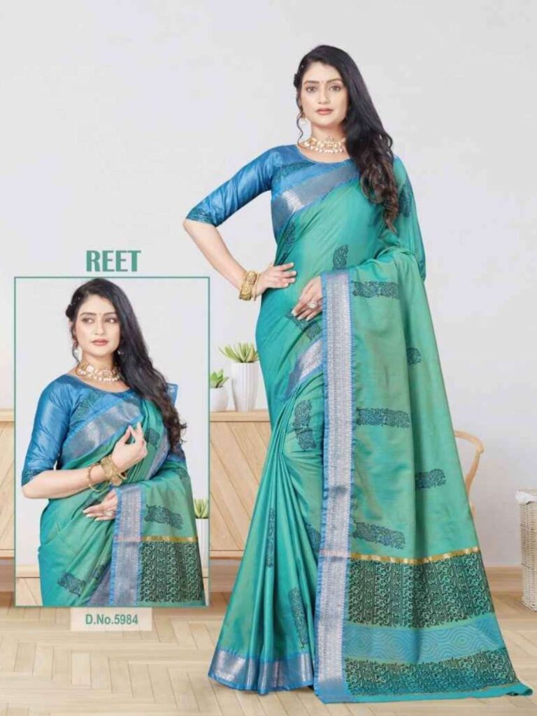 REET ( SOFT COTTON ) HAND BLOCK PRINTED SAREE #5984 – MEDIUM TURQUOISE X DENIM BLUE – [Green]