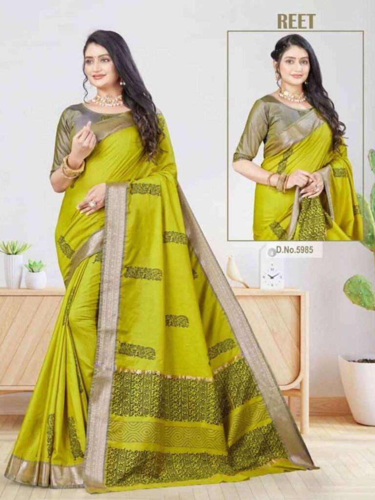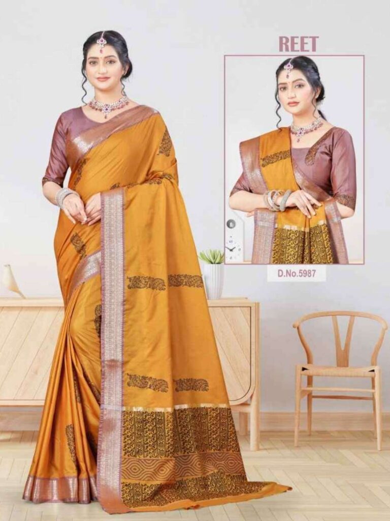 REET ( SOFT COTTON ) HAND BLOCK PRINTED SAREE #5985 – DARK YELLOW X DUSTY GRAY – [Yellow]