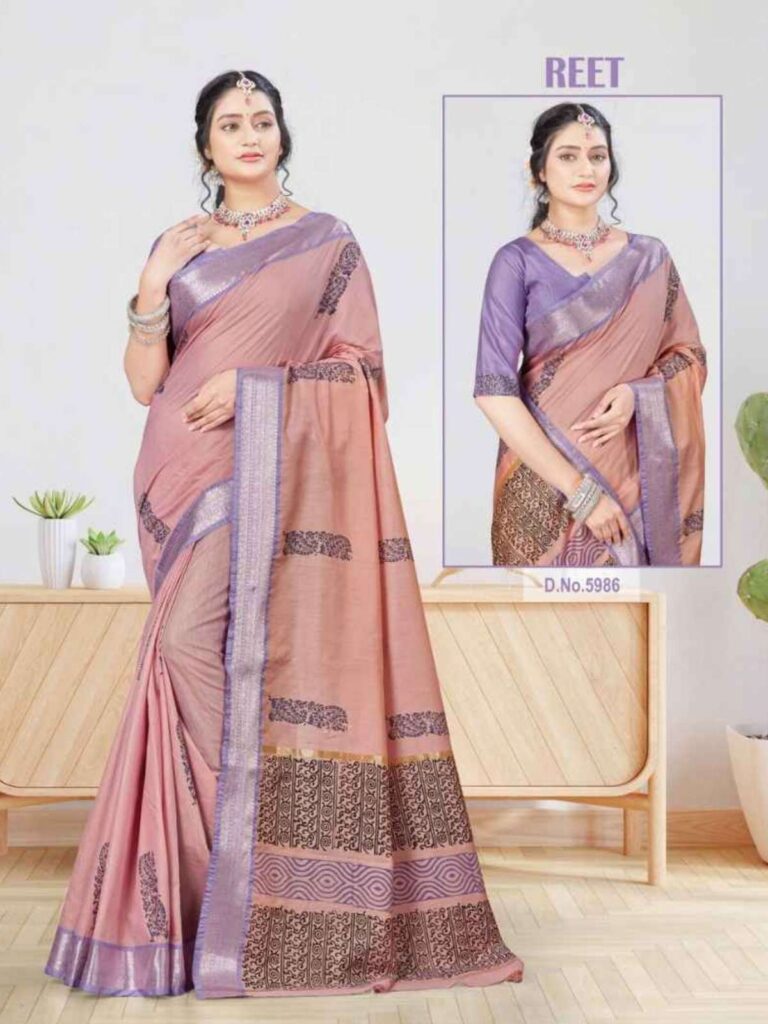 REET ( SOFT COTTON ) HAND BLOCK PRINTED SAREE #5986 – FADDED PINK X SOFT PURPLE – [Pink]