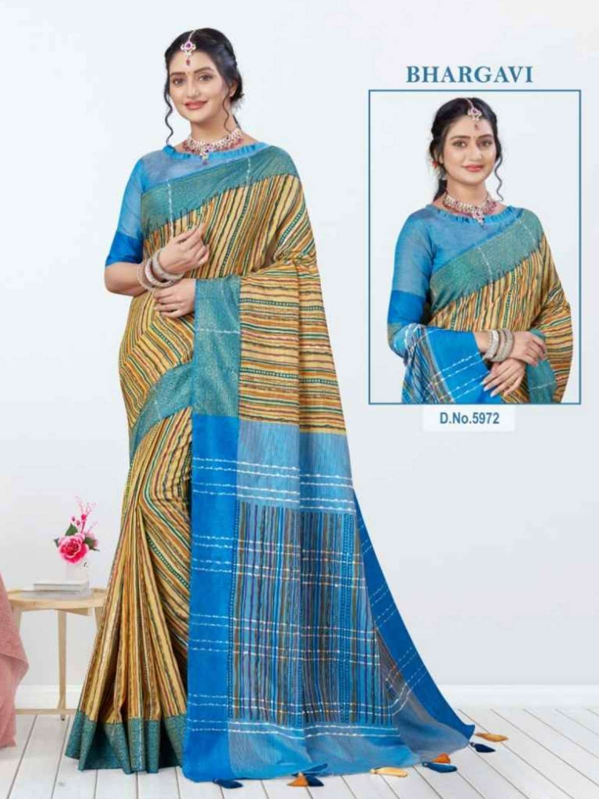 “BHARGAVI” – The “BHARGAVI” saree sounds beautiful! With its silk cotton and Ryan mix fusion material, it offers both elegance and comfort. The tricolor print, combined with a contrasting pallu and blouse, adds a vibrant touch, reminiscent of the traditional Bhagalpuri weaving style. This blend is perfect for both office occasions and Party wear.