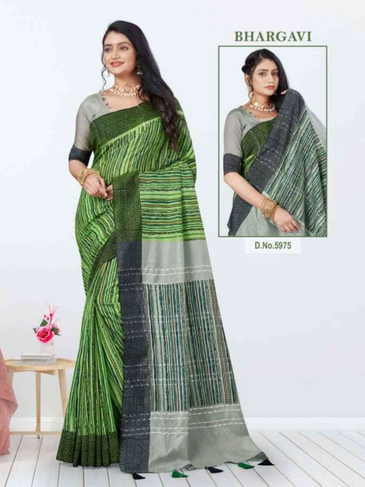 “BHARGAVI” – The “BHARGAVI” saree sounds beautiful! With its silk cotton and Ryan mix fusion material, it offers both elegance and comfort. The tricolor print, combined with a contrasting pallu and blouse, adds a vibrant touch, reminiscent of the traditional Bhagalpuri weaving style. This blend is perfect for both office occasions and Party wear.