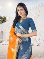 ”TEJASHVI” a special Multi Cotton Jacquard butta weave saree accompany with solid contrast color plain blouse. 2 inch Platinum Zari Border on both sides and contrast color grand pallu. Saree 5.50 Mtr Blouse-1.00 Mtr