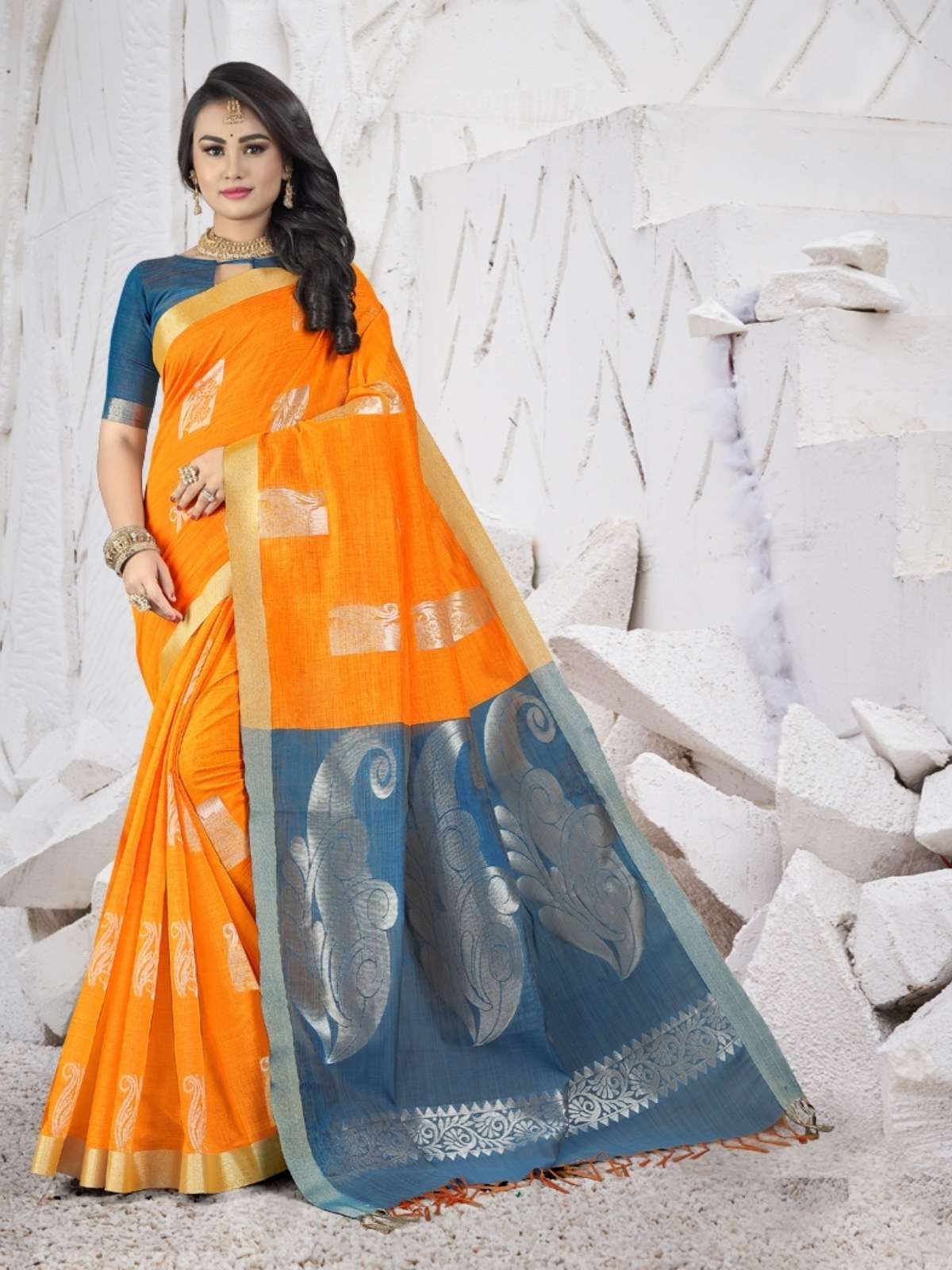 Chettinad Cotton Jacquard Saree -TEJASHVI #5548 Golden Yellow X T.Blue – [Golden Yellow]