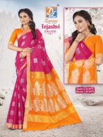 ”TEJASHVI” a special Multi Cotton Jacquard butta weave saree accompany with solid contrast color plain blouse. 2 inch Platinum Zari Border on both sides and contrast color grand pallu. Saree 5.50 Mtr Blouse-1.00 Mtr
