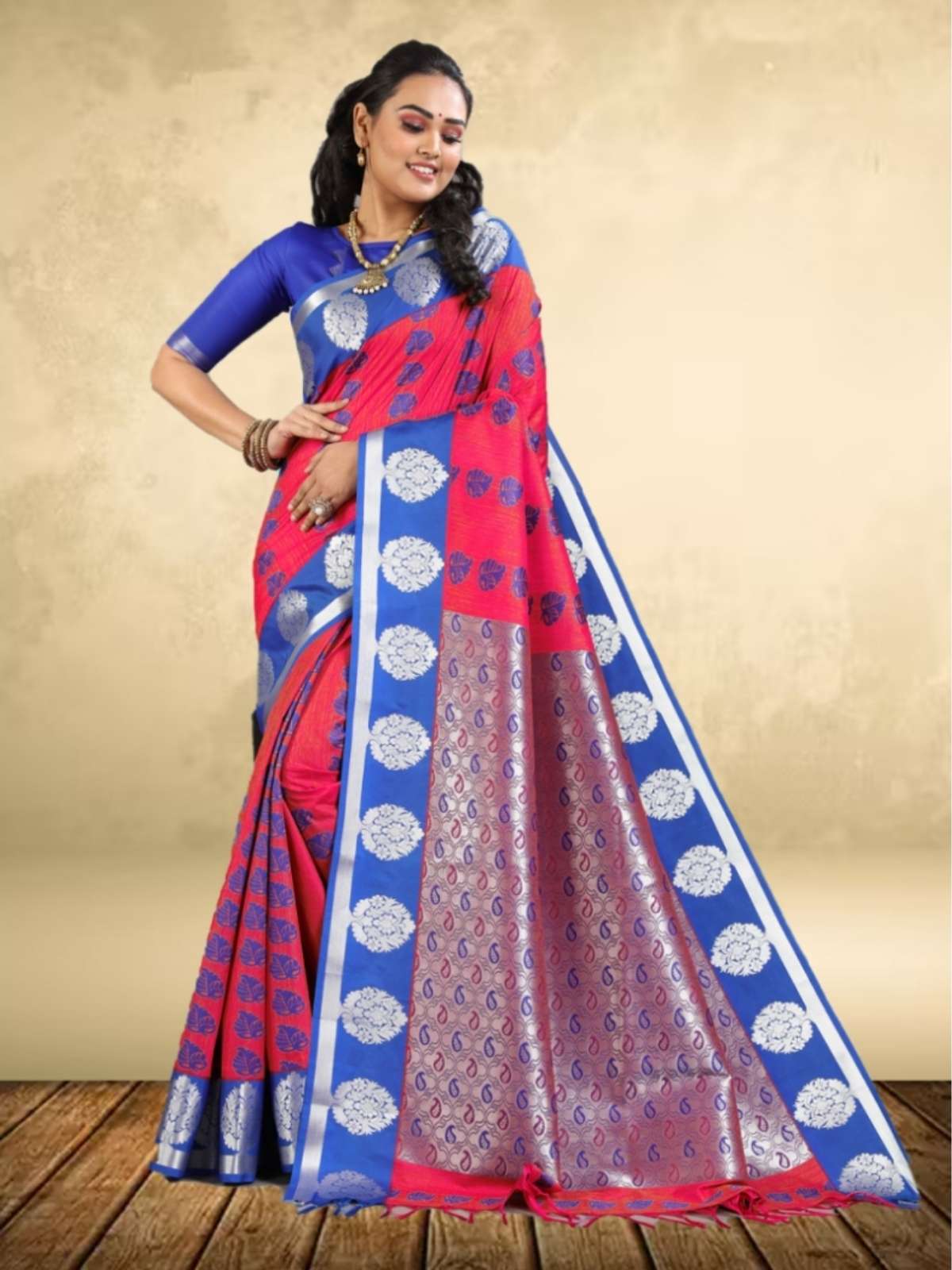 SARADHA “, A beautifully woven soft silk saree, this piece radiates elegance and craftsmanship. The body of the saree features delicate thread butta, intricately spread across the fabric, creating a subtle yet stunning texture. The contrast pallu, designed with a motifs pattern, adds a modern twist to the classic look. Paired with a plain blouse,