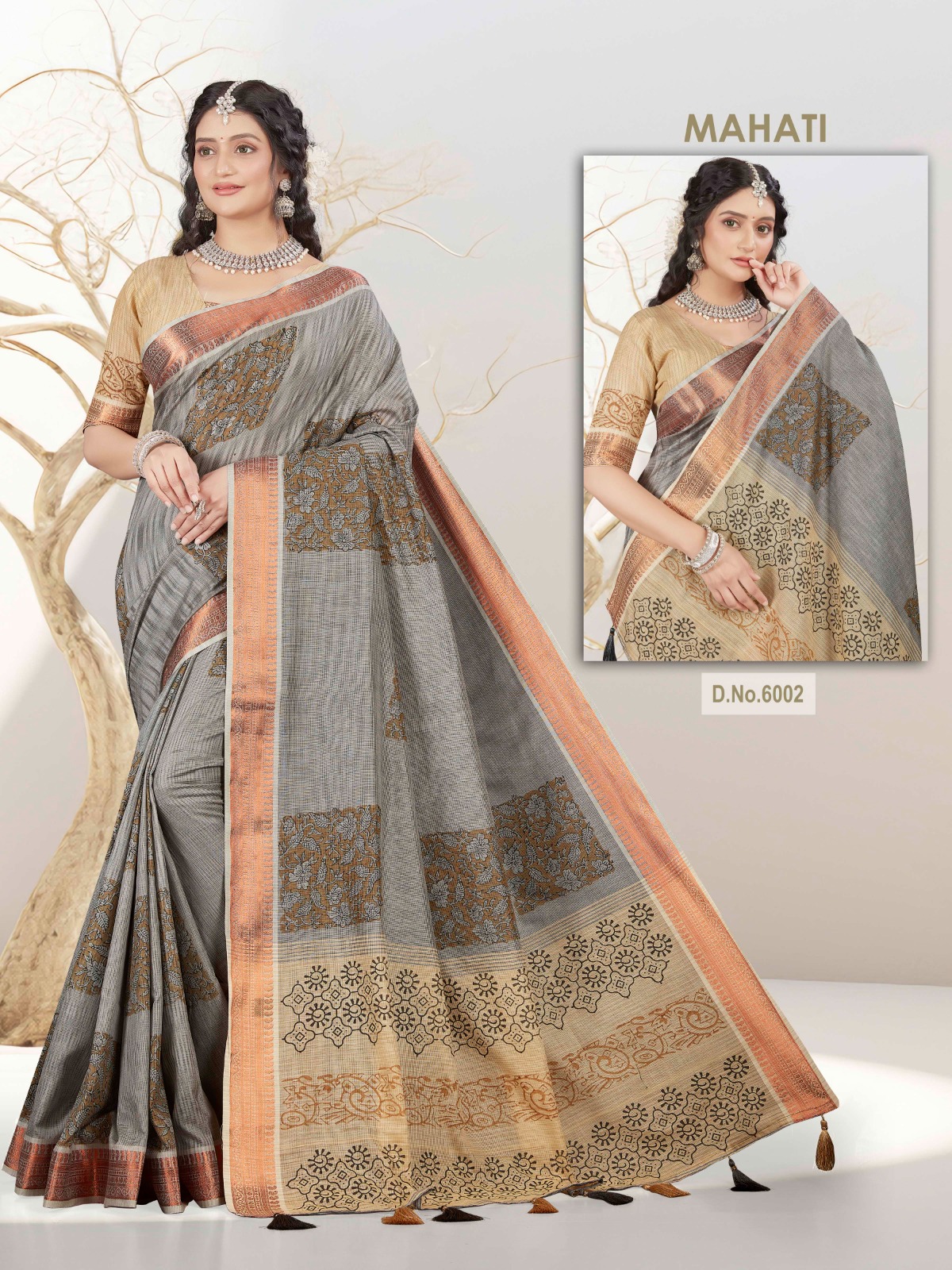 Rich Soft Cotton Saree Woven with Copper Jari Border With Hand Block Print And Cream Colour Printed Pallu & Blouse