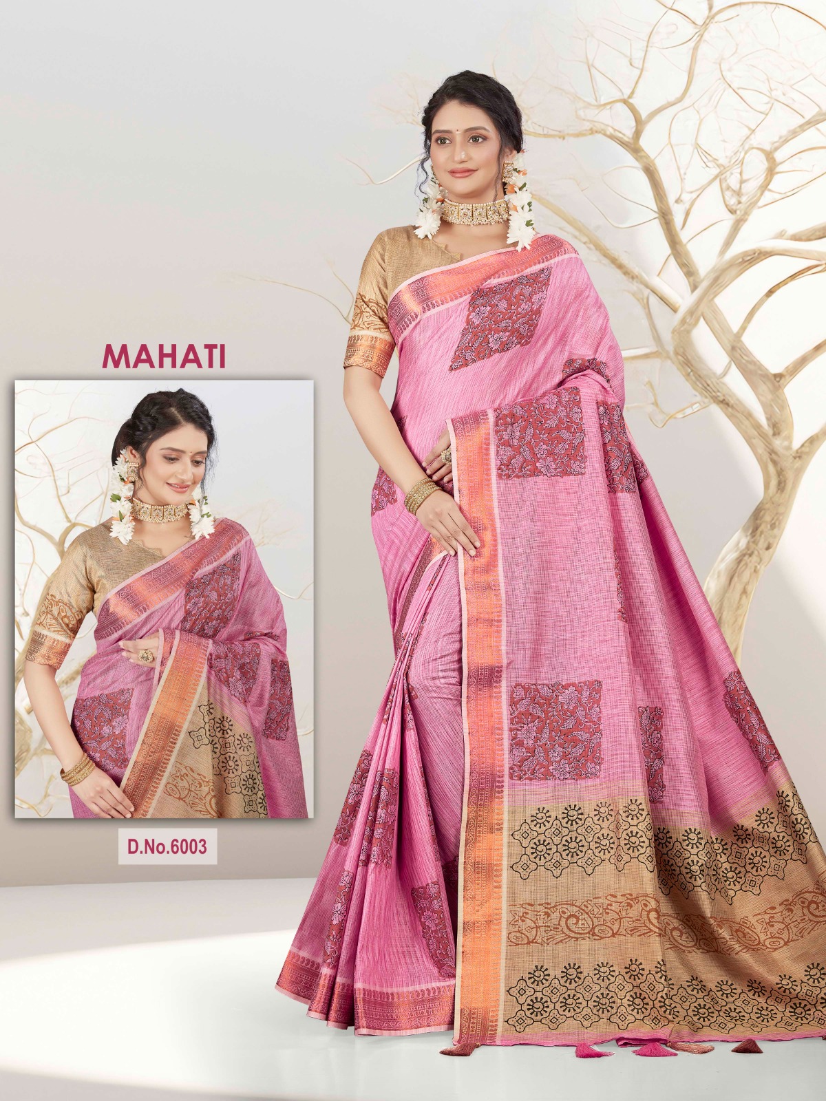 Rich Soft Cotton Saree Woven with Copper Jari Border With Hand Block Print And Cream Colour Printed Pallu & Blouse