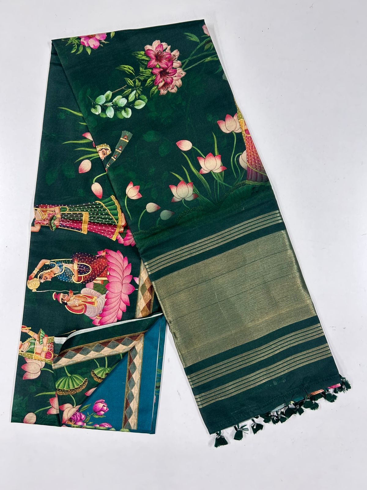 Elegant light weight tusser silk saree with digital Printed all-over body, along with print on pallu with Contrast Colour blouse.