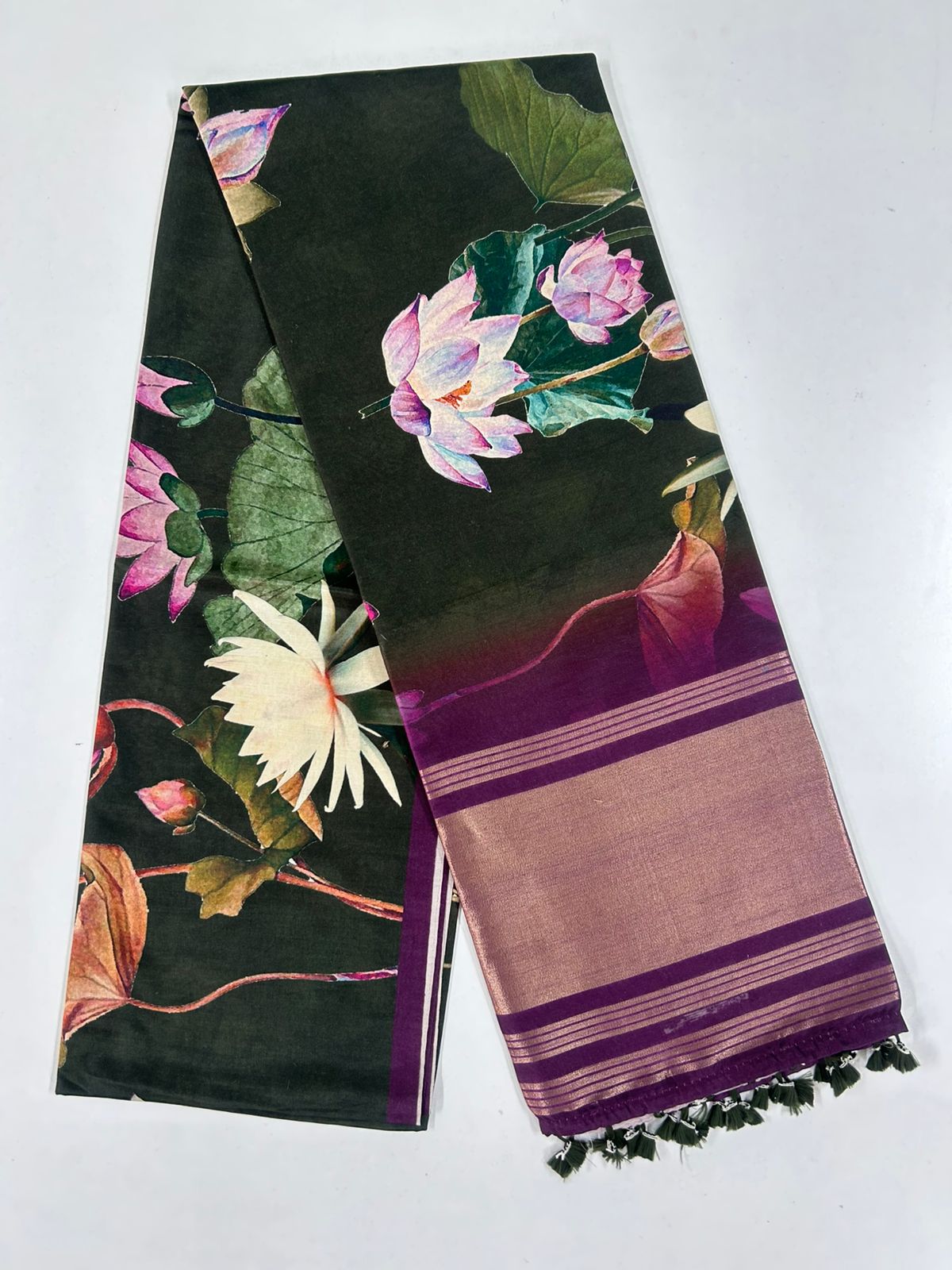 Elegant light weight tusser silk saree with digital Printed all-over body, along with print on pallu with Contrast Colour  blouse.