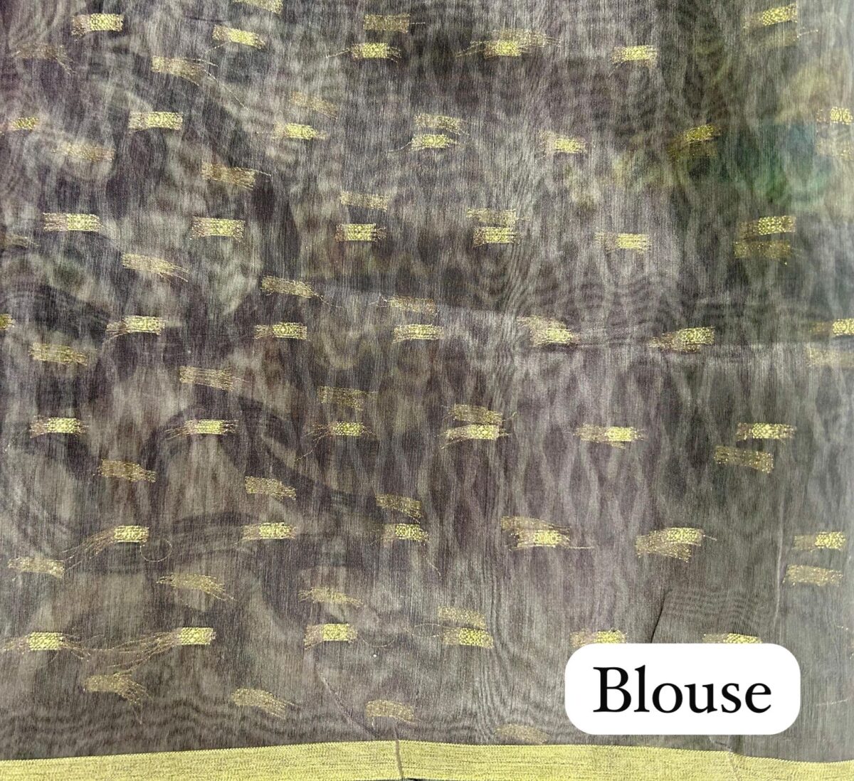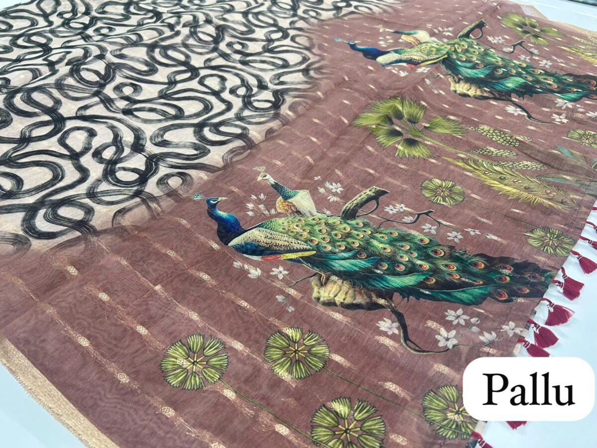 Elegant light weight tusser silk saree with Jari butta alover the body, along with peacock digital print on pallu with solid colour butta blouse.