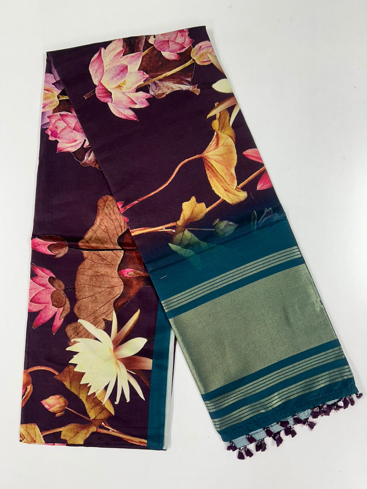 Elegant light weight tusser silk saree with digital Printed all-over body, along with print on pallu with Contrast Colour  blouse.