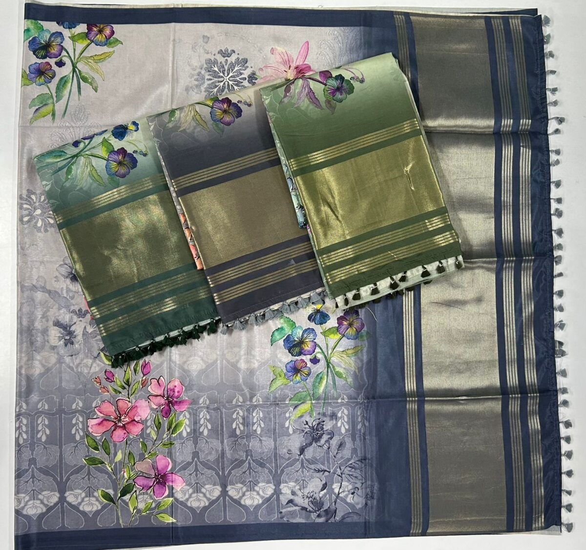 Elegant light weight tusser silk saree with digital Printed all-over body, along with print on pallu with Contrast Colour  blouse.