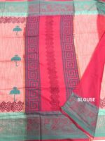REET – the “REET” Soft Cotton Saree, A cotton and silk blend with a jacquard border and umbrella design hand block print adds a lovely touch of sophistication to a saree. The combination of the softness of cotton and the richness of silk makes it comfortable yet elegant, perfect for a variety of occasions.