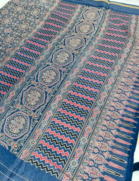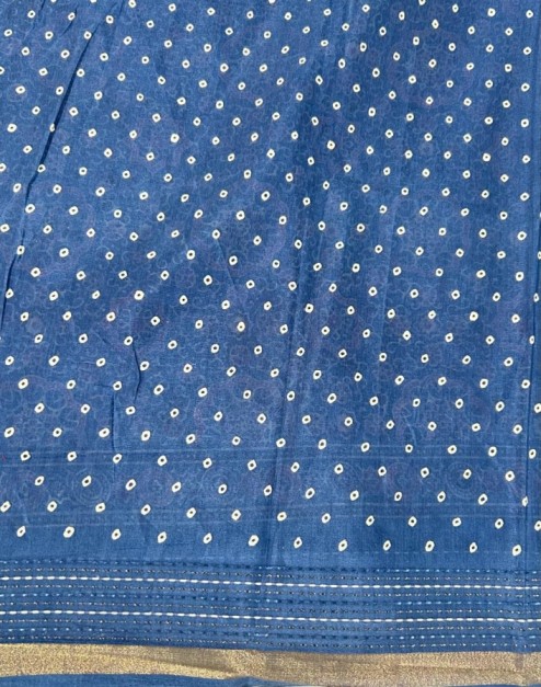 Premium Viscose silk Fabric Saree With Ajark Style print With Kantha Stitch Border Work Along With Printed Self Colour Pallu & Butta Plain Blouse.